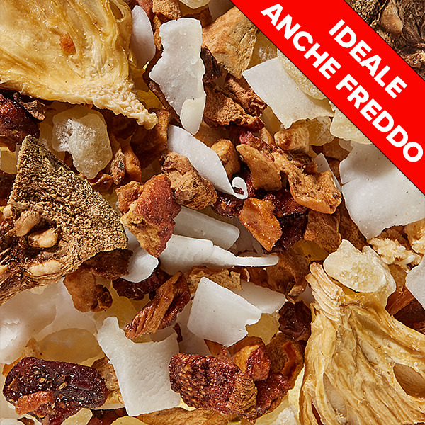 Infuso con karkadè, uvetta, rosa canina, scorze d’arancio, mela, mango, papaya, ananas.