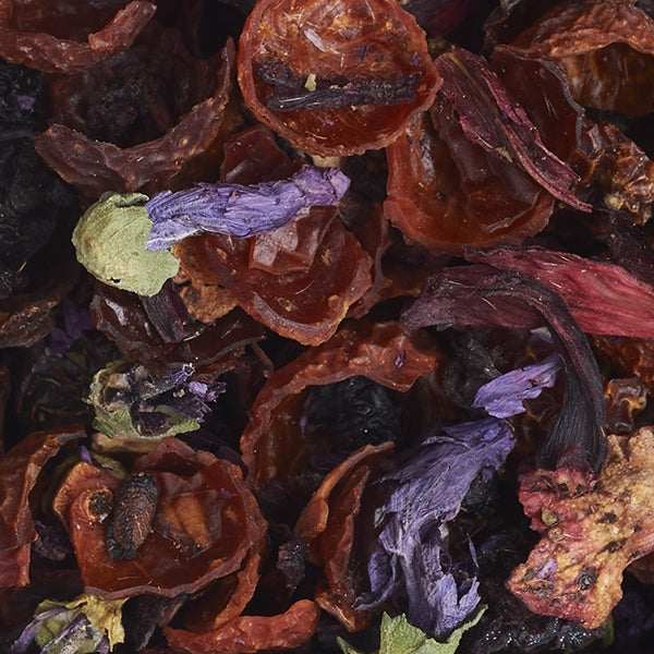Miscela fruttata, dal profumo dolce ed intenso, a base di rosa canina, ricca di vitamine e bacche di mirtillo dalle note proprietà antiossidanti.