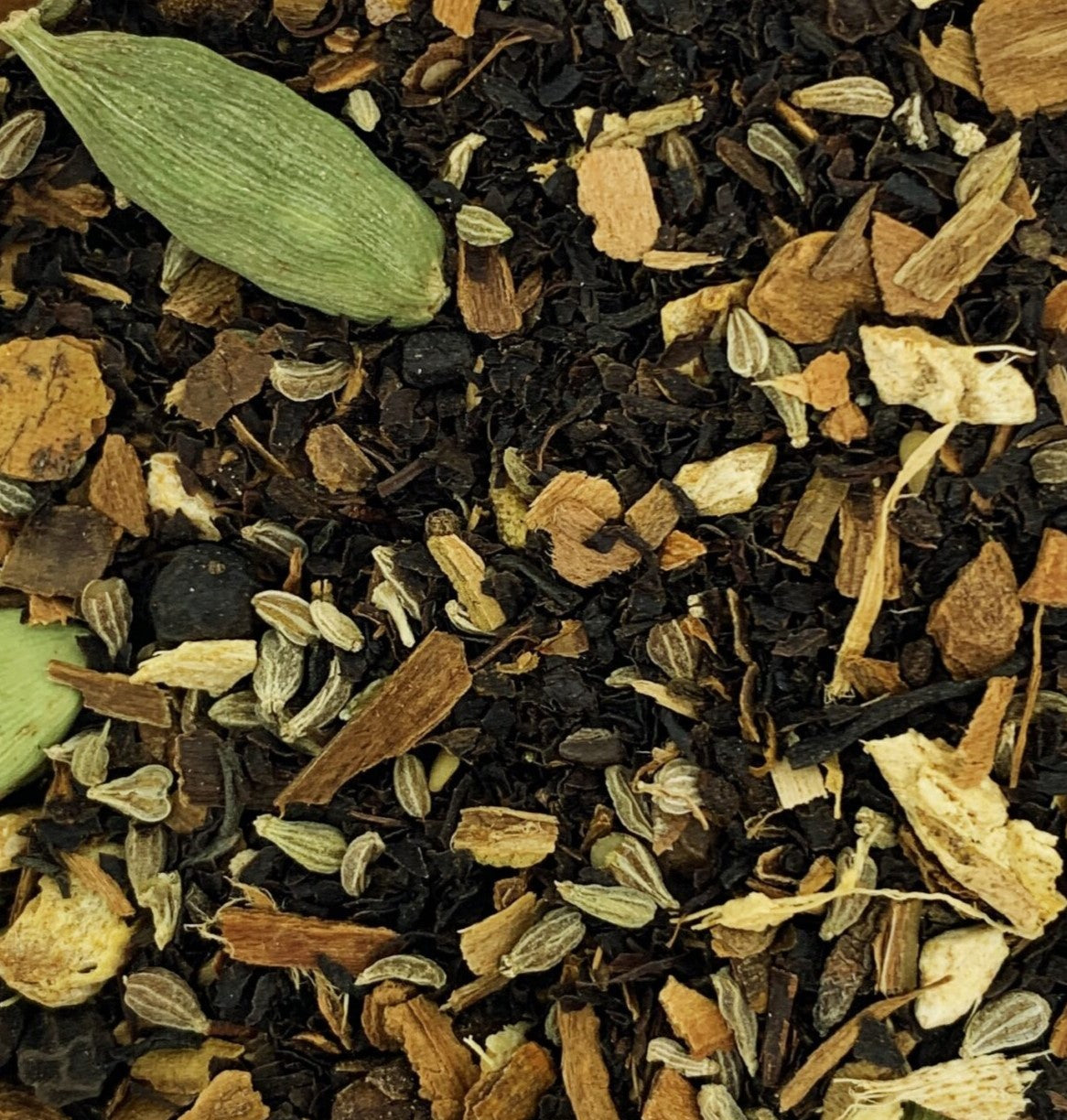 Ingredienti: Tè Nero (India), cannella e zenzero in pezzi, chiodi di garofano, semi di cardamomo e di anice, pepe nero.