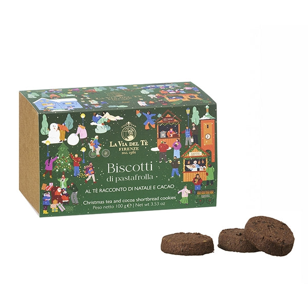 Ingredienti: Farina di FRUMENTO 00, BURRO, zucchero, tuorlo d'UOVO, cacao amaro in polvere 4,4%, tè Racconto di Natale 3% (tè nero indiano, aromi naturali). Valori nutrizionali medi per 100 g: Energia 456 kcal, Grassi 27 g di cui acidi grassi saturi 21 g, Carboidrati 50 g di cui zuccheri 22 g, Fibre 0,9 g, Sale 0,02 g. Può contenere frutta a guscio o soia.