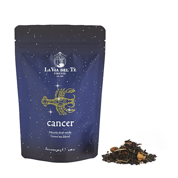 I nati sotto il segno del Cancro (22 giugno-22 luglio, segno di acqua insieme a Scorpione e Pesci, governato dalla luna) sono empatici, sensibili, romantici, alla ricerca di sicurezza e intimità, amanti della famiglia e della casa. Per loro, talvolta sfiduciati ed indecisi, ancorati al passato, una miscela equilibrata e rassicurante di tè verdi e tè bianco aghi d'argento con il profumo intenso dei frutti simbolo dell'estate: pesca e albicocca. Cancer è il nome latino del segno.