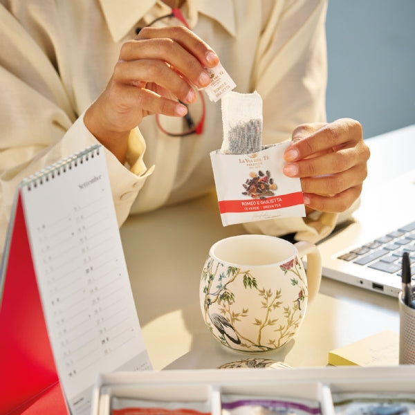 Una confezione regalo per gli amanti dei tè, impreziosita da pattern floreale in argento che riprende la pianta di Camellia Sinensis. Bancha Fiorito, tè verde al gelsomino; English Breakfast, tè nero; Marrakech Mint Tea, tè verde cinese alla menta; Earl Grey Imperiale, tè nero al bergamotto; Special Gunpowder, tè verde cinese; Romeo e Giulietta, tè verde al profumo di fragolina e pezzetti di papaya.