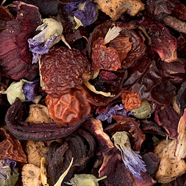 Ingredienti: Karkadè, Rosa Canina 30%, Mela, Aromi, Mirtilli Bacche 2,5%, Sambuco Bacche 2,5%, Aroma Naturale, Calendula Petali, Fiordaliso Petali.