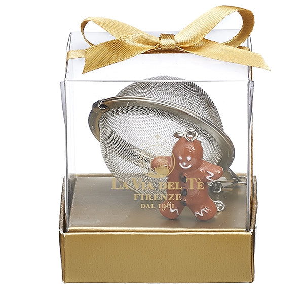 Classico infusore da tè a pallina in acciaio inox con dettaglio omino pan di zenzero. In scatola regalo con fiocco. Diametro: 5 cm. Perfetto per prepararsi una tazza di tè in foglia.