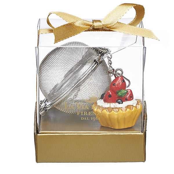 Classico infusore da tè a pallina in acciaio inox con dettaglio pasticcino. Diametro: 5 cm. In scatola regalo. Perfetto per prepararsi una tazza di tè in foglia.