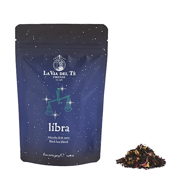 I nati della Bilancia (23 settembre-23 ottobre, segno di aria governato da venere) possiedono spiccato il senso della bellezza, doti artistiche e innato ottimismo. Per soddisfare il loro desiderio di equilibrio e la loro predilezione per cibi e bevande eleganti e leggere, abbiamo creato una miscela soave e Bilanciata di tè nero Indiano Darjeeling e tè neri cinesi, dall' aroma di frutta matura e lo spunto floreale di orchidea e rose. Libra è il nome latino del segno.