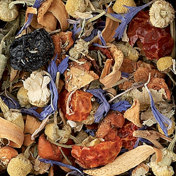 Ingredienti: Mela, Camomilla, Rosa Canina, Verbena, Ribes Nero, Arancio Fiori, Tiglio Fiori e Brattee, Aroma Naturale, Fiordaliso Petali.