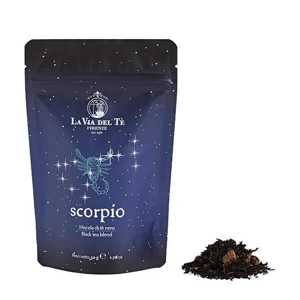 I nati in Scorpione (23 ottobre-22 novembre, segno d'acqua insieme a Cancro e Pesci, dominato dal pianeta Marte) lottano per ciò in cui credono, sono appassionati, estroversi, solari e molto indipendenti. Per loro, dotati di sensualità naturale, amanti della buona tavola e dei gusti intensi e talvolta estremi, è perfetta questa miscela di tè neri aromatica e corposa, arricchita dalle note dolci e intense di vaniglia e cioccolato. Scorpio è il nome latino del segno.