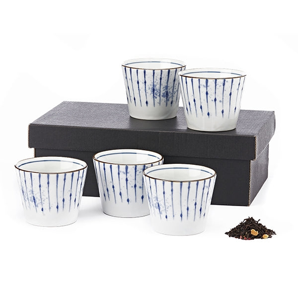 Set di 5 tazze artigianali, con decorazione blu su sfondo bianco. Le linee irregolari di queste tazze sono un esempio di vero design Giapponese. La decorazione blu su fondo bianco sono tipiche delle porcellane di Arita. In Asia i numeri dispari sono ben auguranti per questo spesso i set di vasellame contengono 5 tazze.