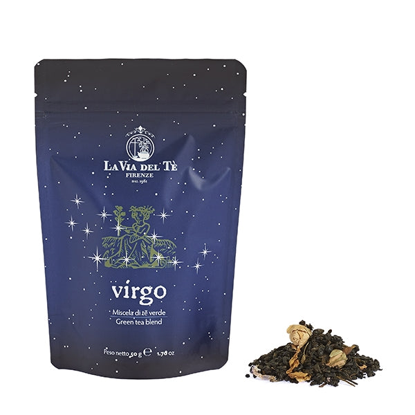 La Vergine (23 agosto-22 settembre) è un segno di terra, caratterizzato da un acuto spirito di indagine, precisione ed individuazione degli obiettivi. Per ispirare i nati di questo segno, naturalmente eleganti e dinamici, ma ben radicati nel reale e nel quotidiano, una creazione a base di tè verdi Special Gunpowder, Lung Ching, (fonte del drago) e petali di fiori, dall'aroma fresco e leggero di mela, agrumi e fico. Virgo è il nome latino del segno.